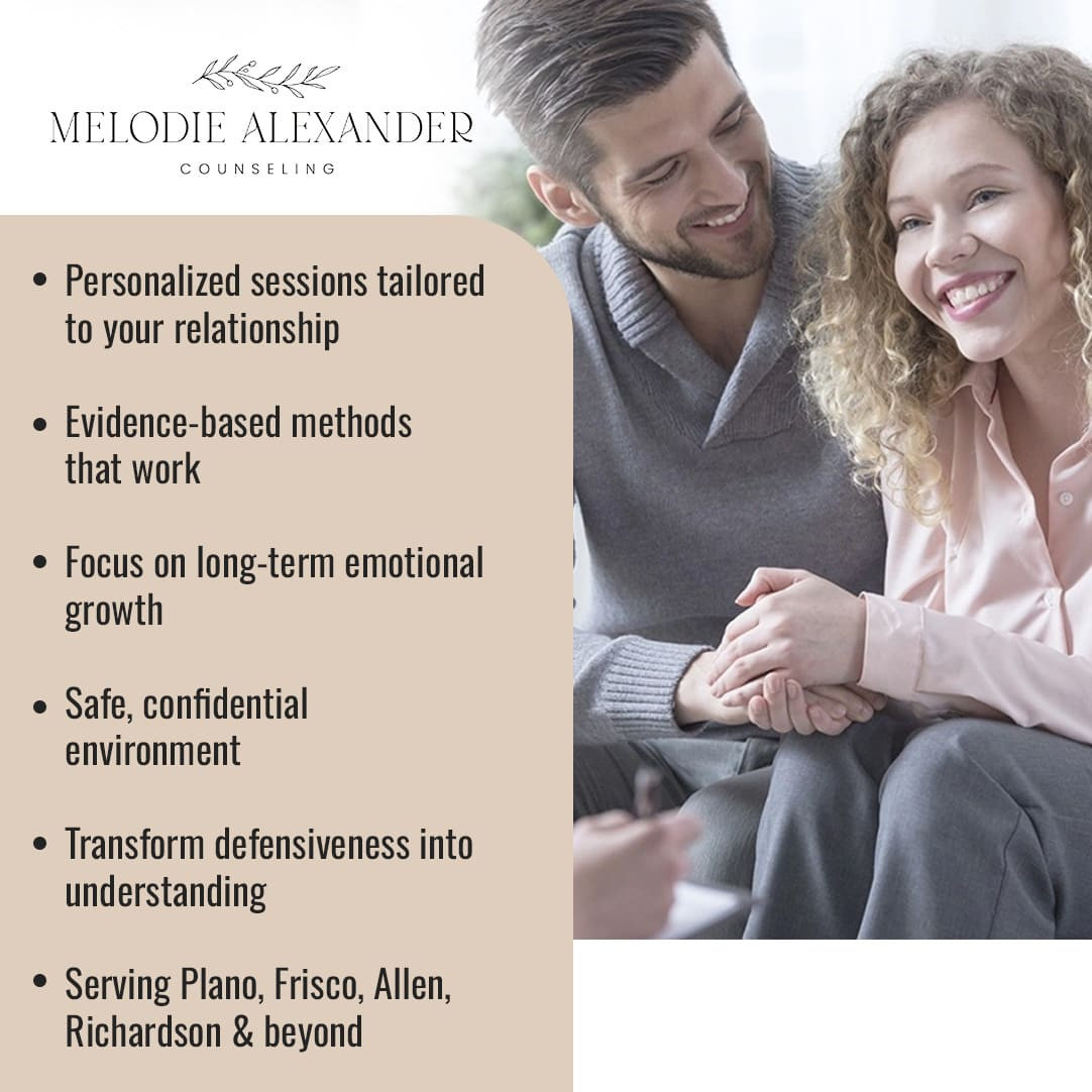 Each session at Melodie Alexander Counseling in Plano is designed to rebuild trust and strengthen bonds across Plano, Frisco, Allen, Richardson, and surrounding North Texas communities.